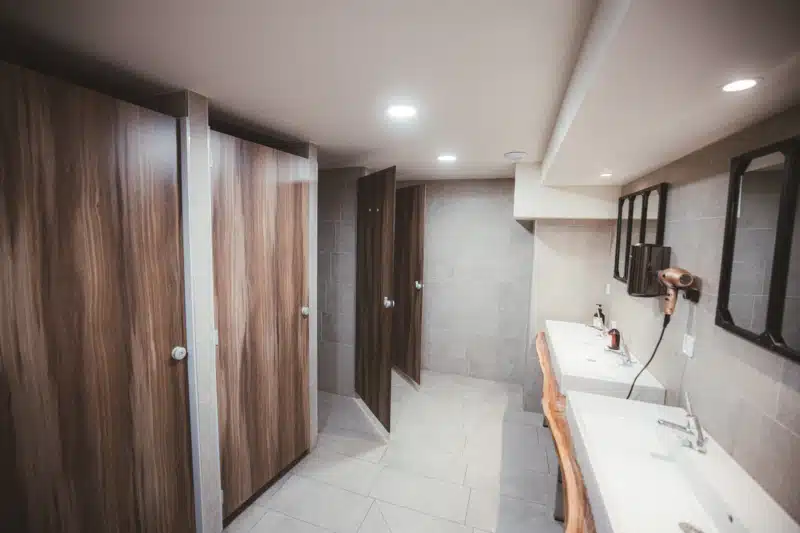 On a tout prévu : des réceptacles pour serviettes usagées, des douches individuelles, bien larges avec thermostat réglable, pour te détendre à ta température et un espace pour déposer tes affaires, te sécher et te rhabiller peinard, à l’abri des regards.